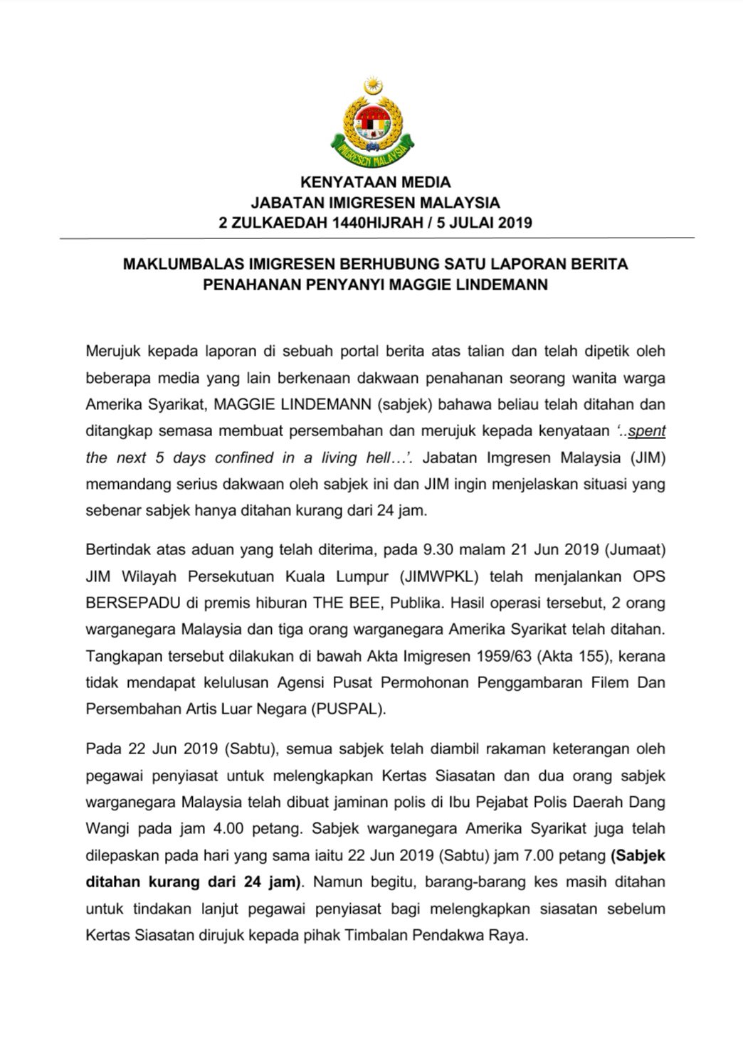 Imigresen Malaysia On Twitter Maklumbalas Imigresen Berhubung Satu Laporan Berita Penahanan Penyanyi Maggie Lindemann Https T Co Tl3smtgmcv Https T Co 8npzklbqz3 Twitter